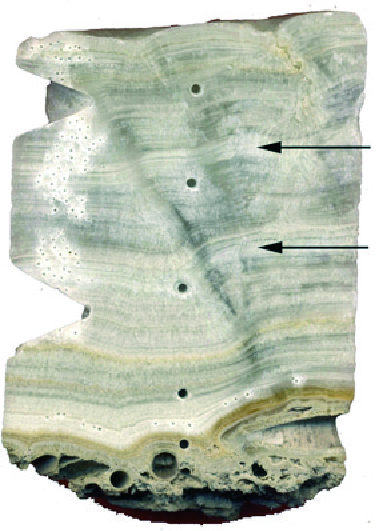 If there is more rainfall or if the soil above the cave is less thick, water enters more readily and faster into the cave. The water then absorbs other elements which end up in the stalagmite. For example, much higher concentrations of the elements magnesium and strontium in today's samples show that it is warmer and drier now compared to the 17th century.. These elements enter the cave when the water takes longer to seep into the cave.