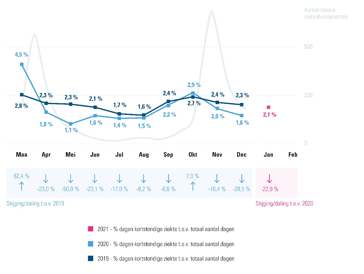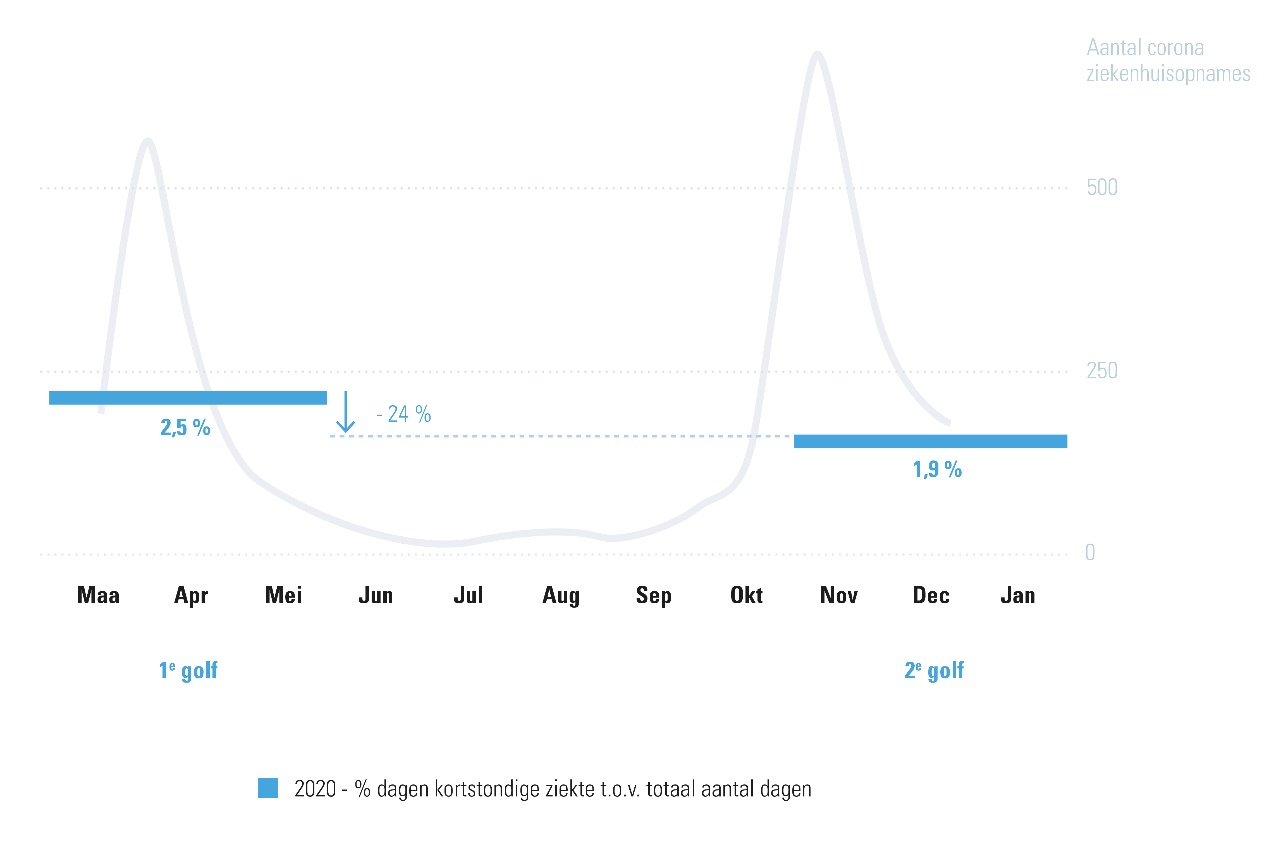 Figuur 2: Kortstondig ziekteverzuim 1e vs. 2e golf + januari 2021