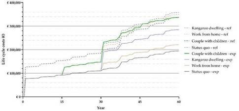 Cambier: “Dit komt omdat de aanpasbare woning in de beginfase enkel met die ruimtes start die op dat moment voor de gezinssituatie nodig zijn. Hierdoor moeten er minder materialen moeten aangekocht worden, waardoor de aankoopkosten al lager liggen. Maar in de volgende jaren liggen ook de onderhoudskosten lager omdat er minder gebouwelementen zoals schrijnwerk, afwerkingsmaterialen etc. moeten onderhouden en gerepareerd worden. Om dezelfde reden is de aanpasbare woning ook materiaalefficiënter en ligt de impact op het milieu lager.