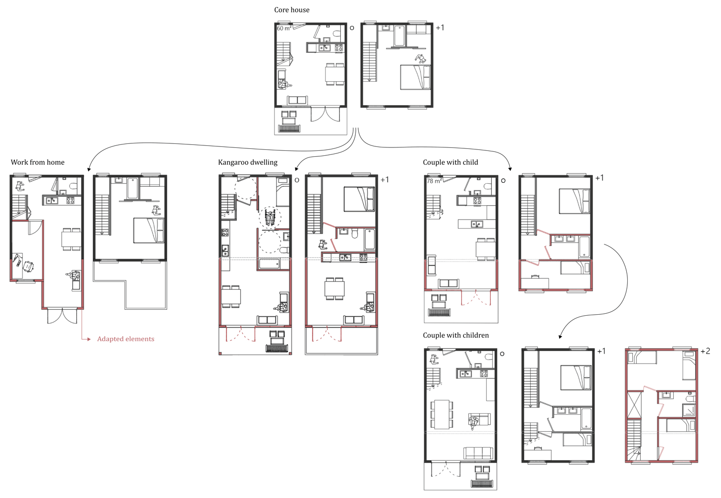 Een ‘aanpasbaar gebouw’ kan makkelijker en met minder bouwmateriaal en -afval aangepast worden aan de veranderende noden van de bewoners. Hoe? Door vooraf ruimtes zo te organiseren dat ze makkelijk te veranderen zijn en door onderdelen zoals schrijnwerk en binnenwanden demonteerbaar en herbruikbaar te maken. In het onderzoek van Cambier start de aanpasbare woning vanuit een kleine kern die op verschillende manieren kan uitgebreid worden. Door deze soort woning naast een doorsnee Vlaamse rijwoning te leggen, konden beide woningtypes op verschillende vlakken vergeleken worden.