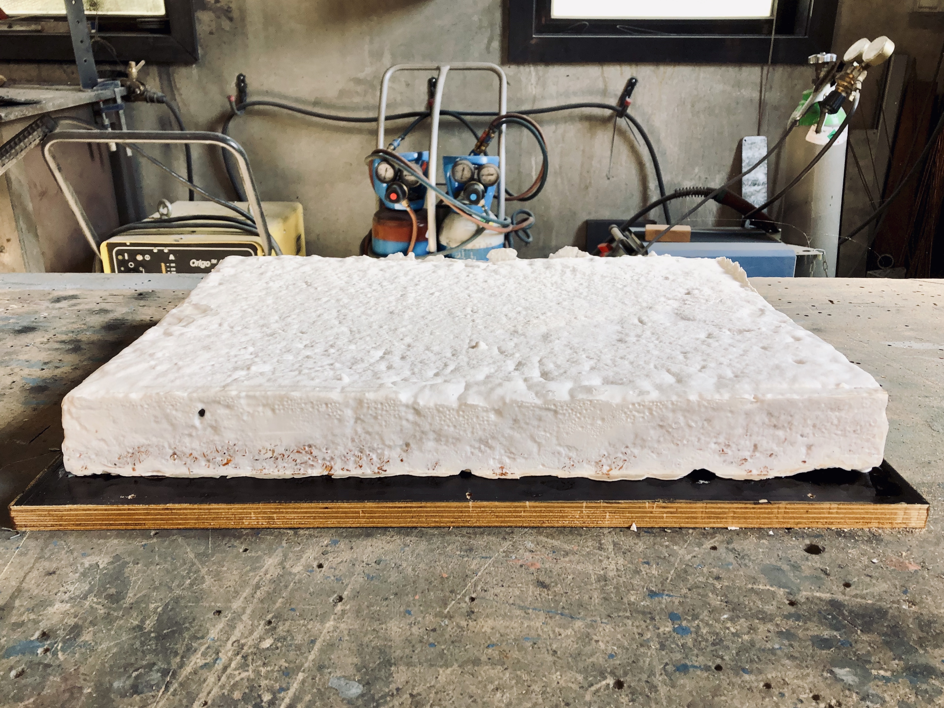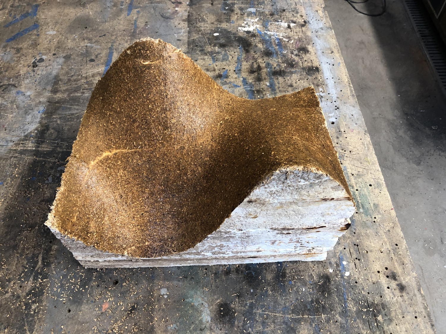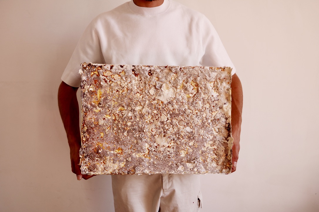 Insulation panel made of mycelium grown on a substrate of 300 disposable coffee cups and beech wood chips. Photo by Lennert Van Rompaey for his master’s thesis “Design by Degradation, Degradation by Design: Fungal bioremediation of plastic waste in the new construction paradigm” (VUB).