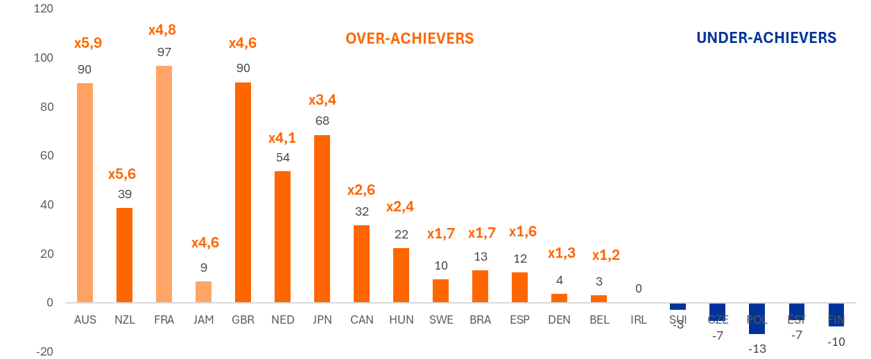 “Ons onderzoek, waaraan 17 landen deelnamen, toont aan dat 40% van het sportieve succes van een land bepaald wordt door populatie en welvaart, terwijl beleidsmatige keuzes steeds belangrijker worden. Een mooi voorbeeld hiervan is Nieuw-Zeeland, dat met 5,2 miljoen inwoners in Parijs 20 medailles won in negen sporten. Dat is bijna 6 keer beter dan wat op basis van de populatie en rijkdom voorspeld wordt en kan verklaard worden door een sterk lange termijn strategisch beleid.”
