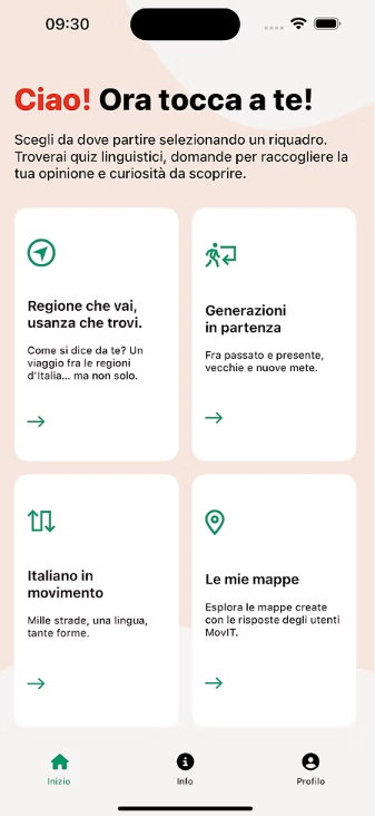 De MovIT-app verzamelt via crowdsourcing taaldata van Italianen in het buitenland. Gebruikers kunnen enquêtes invullen, spraakfragmenten opnemen en deelnemen aan interactieve quizzen. De app bouwt zo aan een unieke databank van het Italiaans in migratiecontexten.