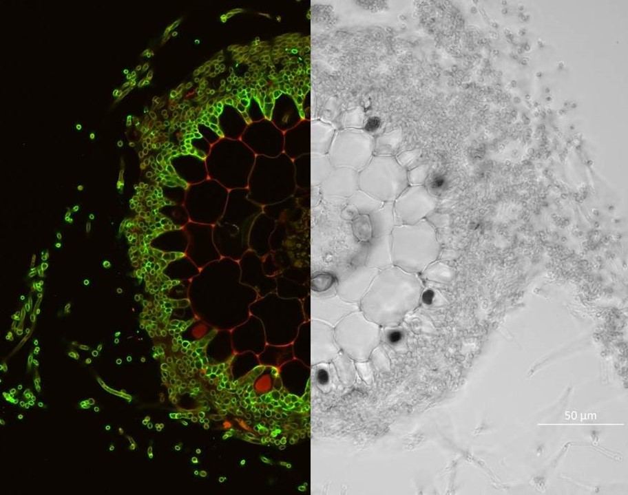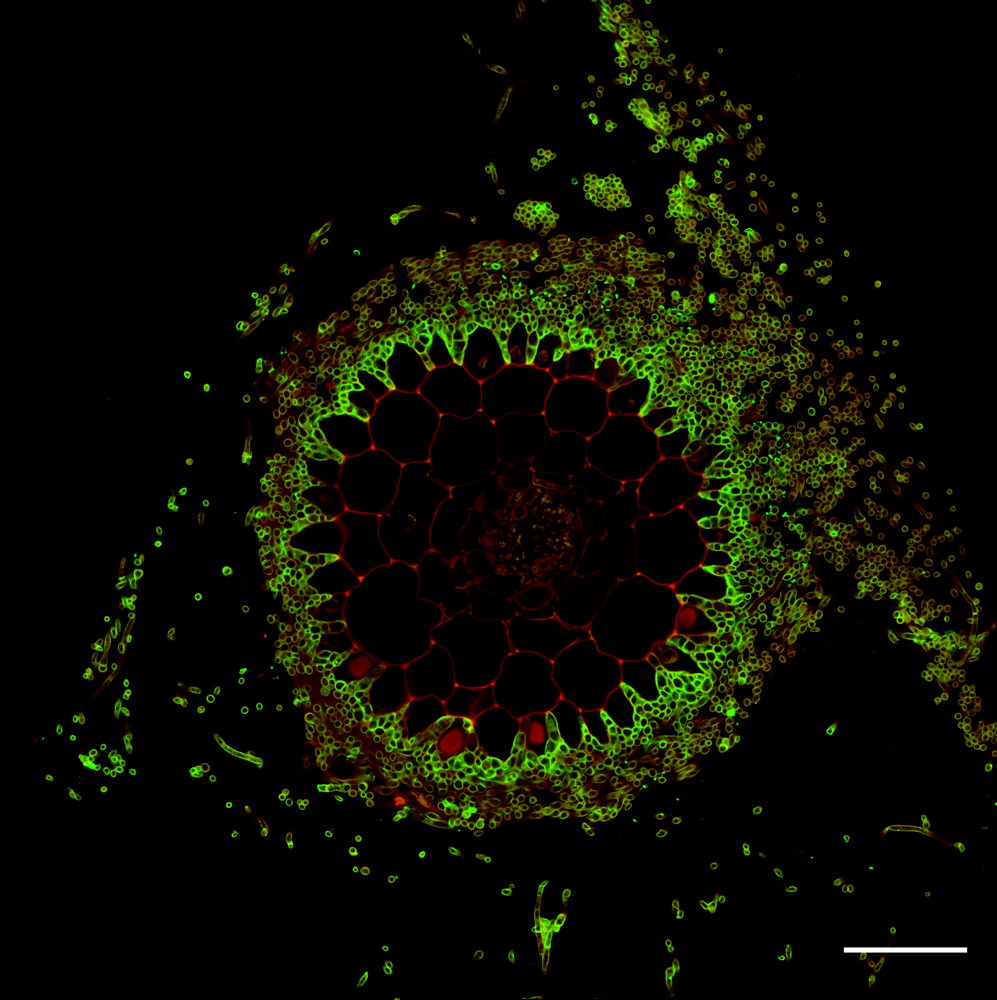 Afbeelding 2+3. Doorsnede door ectomycorrhiza wortel. De schimmel (groen) vormt een mantel rond de wortel (rood) en groeit tussen de buitenste laag cellen.