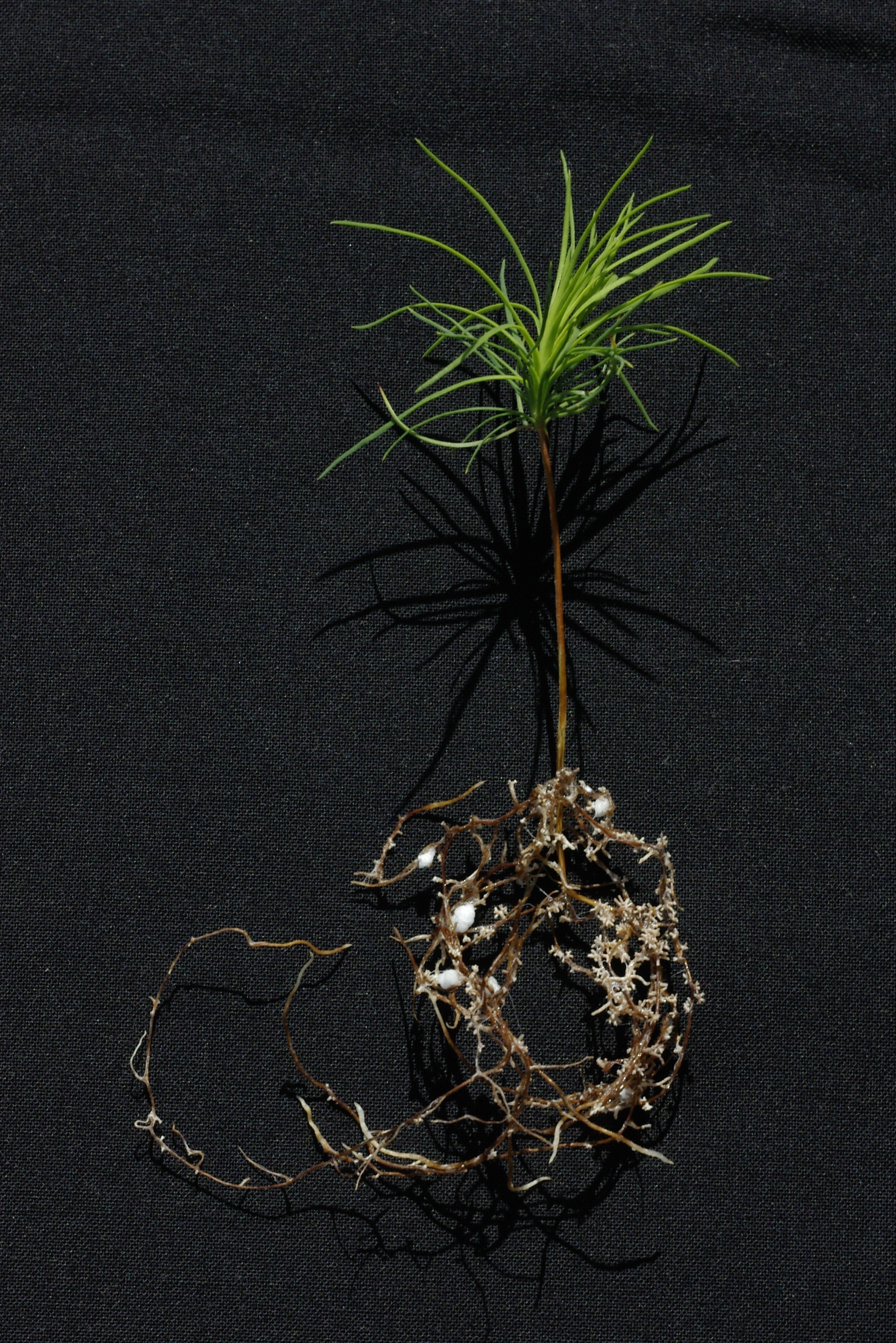 Afbeelding 5. Dennenzaailing waarbij de wortels gekoloniseerd zijn door een mycorrhizaschimmel.
