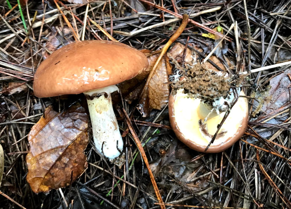 Afbeelding 1. Bruine ringboleet die wit netwerk van draden vormt in de bodem.