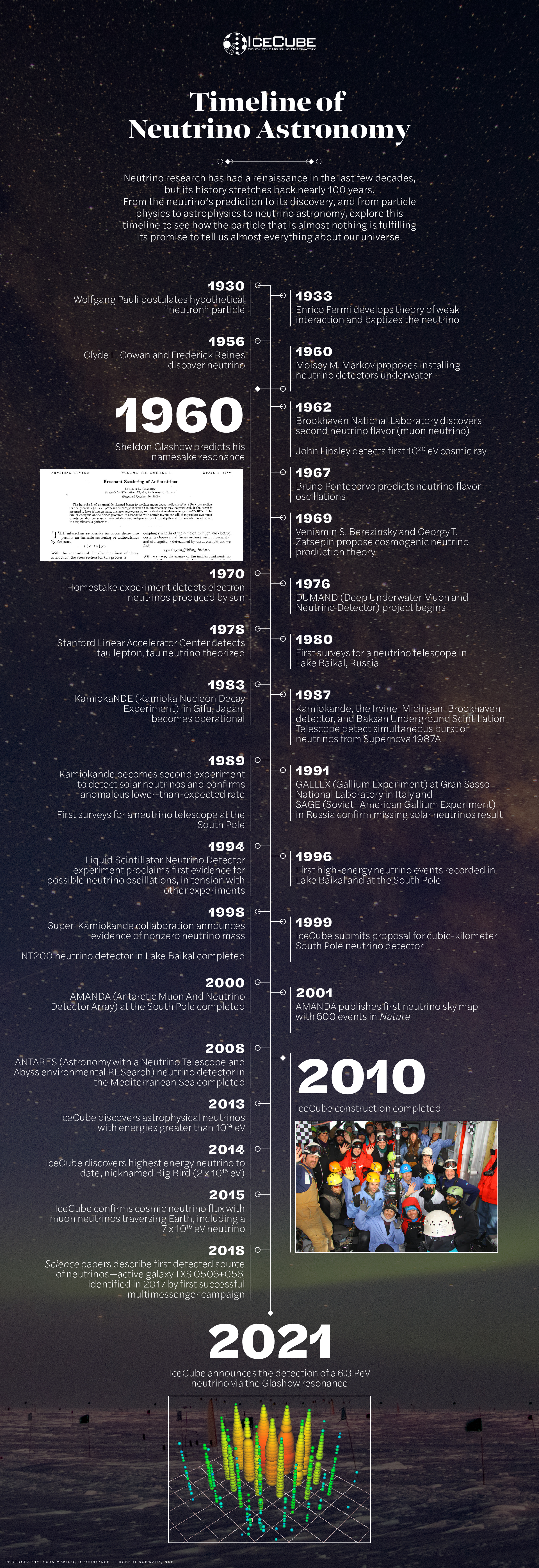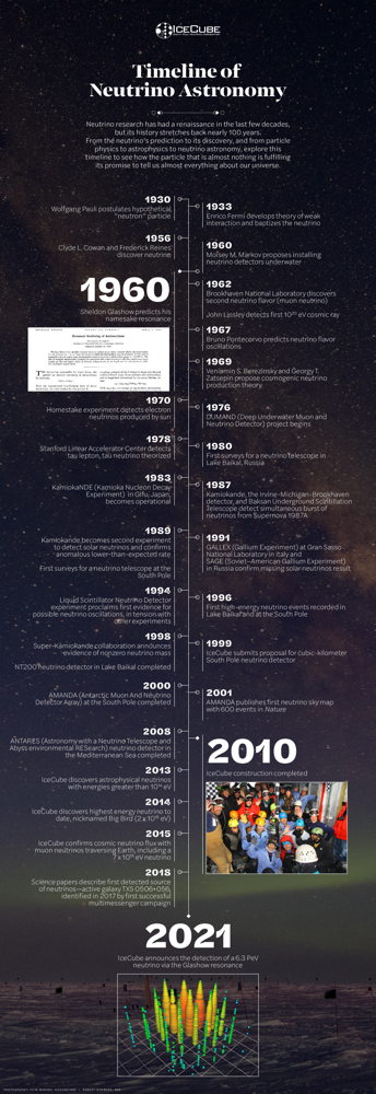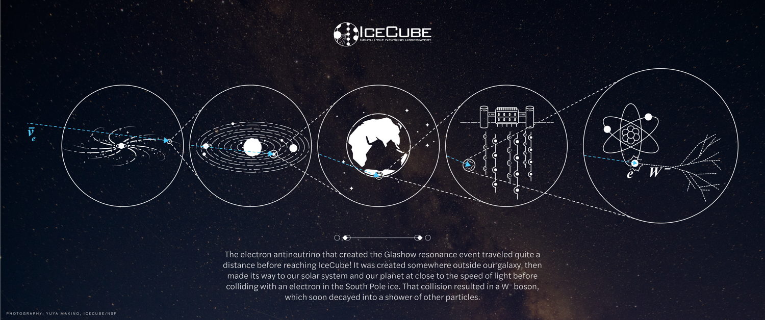 Neutrinos and antineutrinos, the antimatter twin of a neutrino, are ghostly subatomic particles that can be found in the most extreme environments in the universe. On 8 December 2016, for example, a high-energy particle raced from space to Earth at a speed approaching the speed of light and carrying 6.3 petaelectronvolts (PeV) of energy. Deep in the ice cap at the South Pole, it collided with an electron and produced a particle that rapidly decayed into a shower of secondary particles. This interaction was captured by the IceCube Neutrino Observatory, a huge telescope buried in Antarctica’s glacier. IceCube had observed a Glashow resonance, a phenomenon predicted in 1960 by Nobel laureate Sheldon Glashow.
