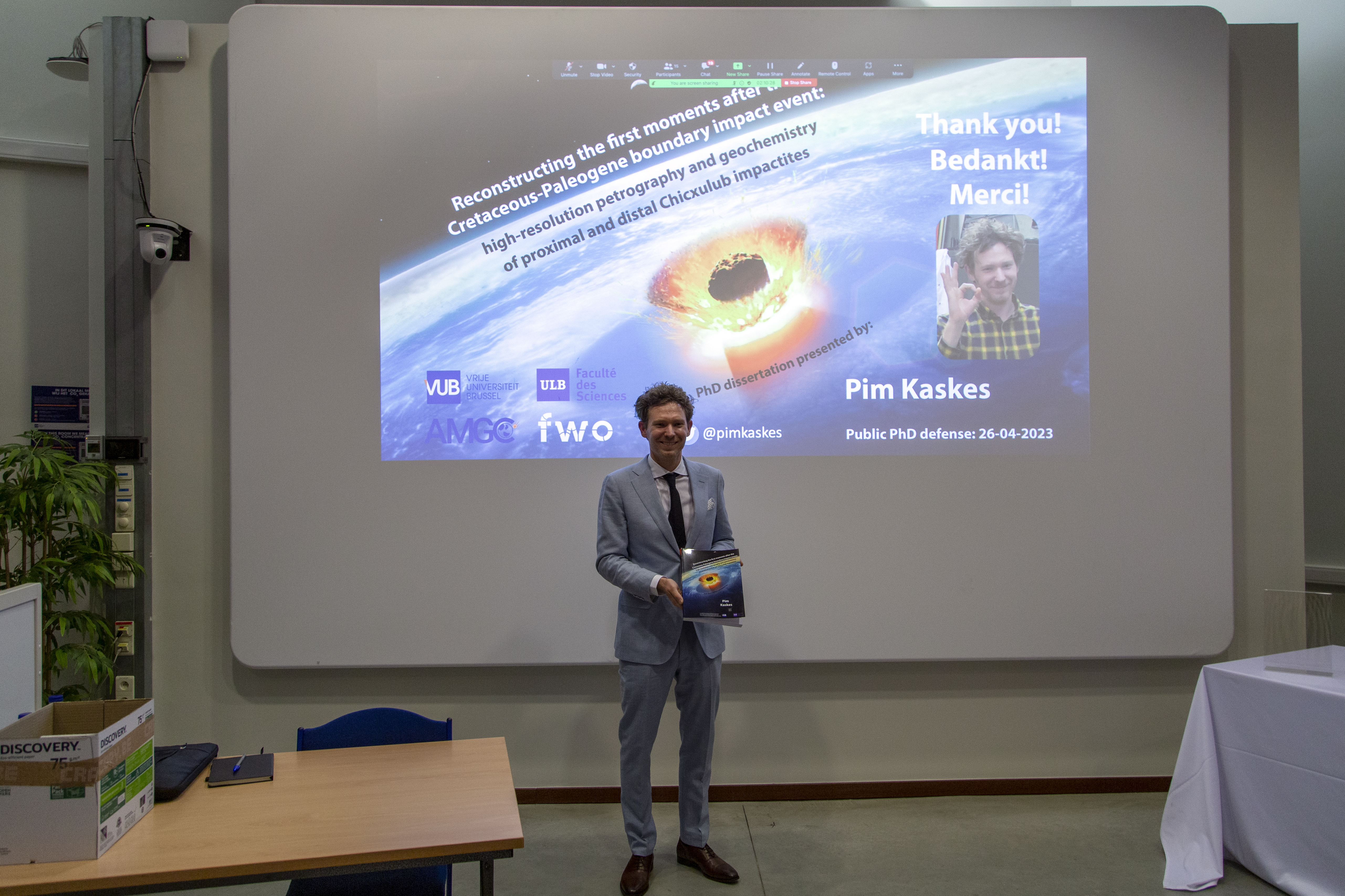 “De Chicxulub meteorietinslag is één van de meest catastrofale gebeurtenissen geweest in de geschiedenis van onze planeet”, zegt Kaskes, die zijn doctorstitel op de VUB behaalde op woensdag 26 april jongstleden. “De inslag bracht een abrupte klimaatverandering teweeg en de Krijt-Paleogeen massa-extinctie, verantwoordelijk voor het uitsterven van driekwart van het leven op Aarde, waaronder de niet-vliegende dinosauriërs. De enorme milieuveranderingentoen zijn hoogstwaarschijnlijk veroorzaakt door grote hoeveelheden gebroken, gesmolten en verdampt gesteente van de inslagplek dat pijlsnel de atmosfeer in werd geslingerd. De timing en exacte mechanismen van deze inslagprocessen zijn echter nog niet goed begrepen en dat heb ik onderzocht in mijn proefschrift.”