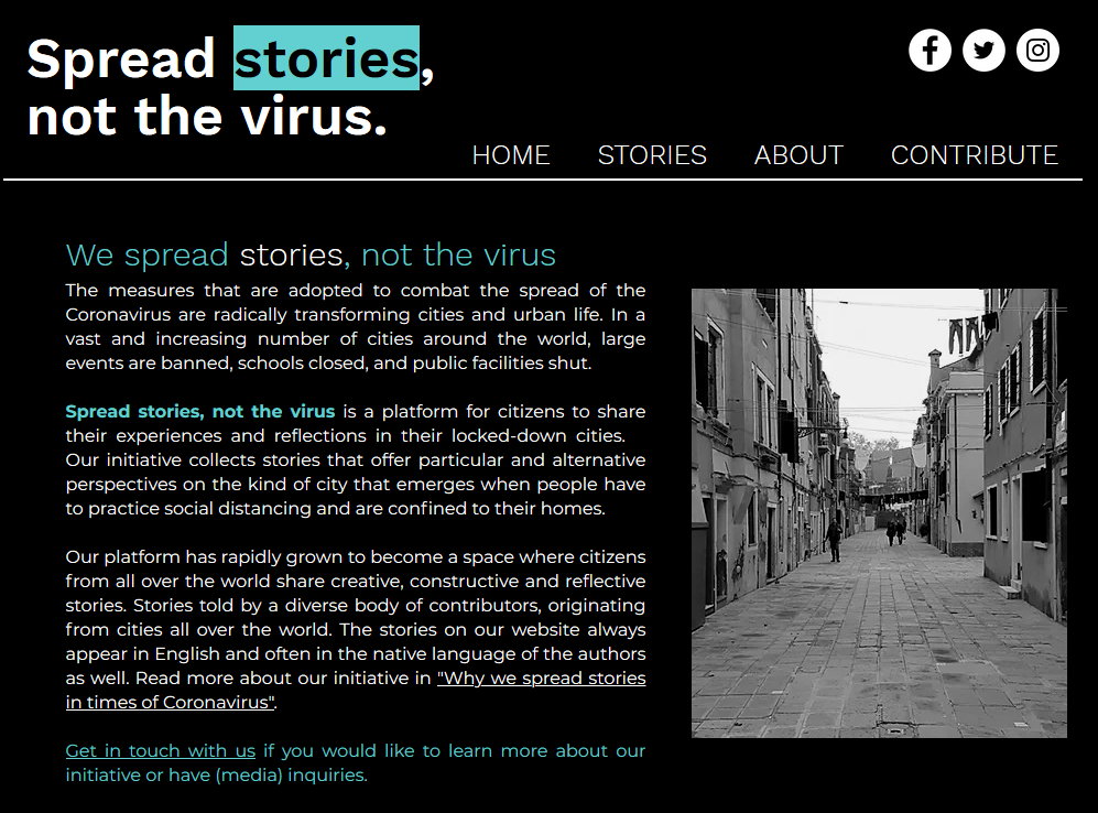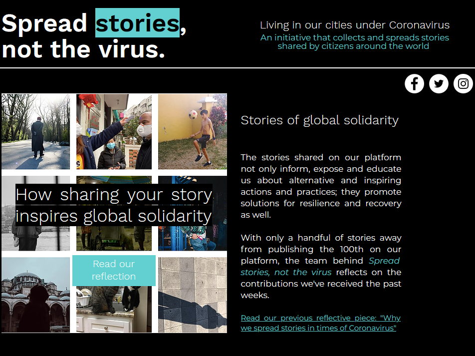 The website www.spreadstoriesnotthevirus.com was launched on 16 March, followed by accounts on Facebook, Twitter and Instagram, and received 85 stories within the first 10 days, in English and in many other languages. The stories come from across the world, such as the story of the midwife in a hospital in northern Italy who, surrounded by coronavirus patients, is bringing new life into the world. Or the German theologian who shares quarantine tips based on his experience of a monastery, or the drawings by a Syrian architecture student in Damascus.