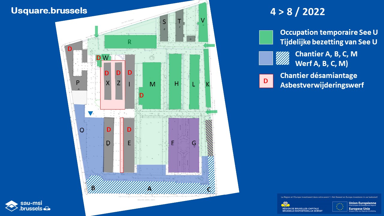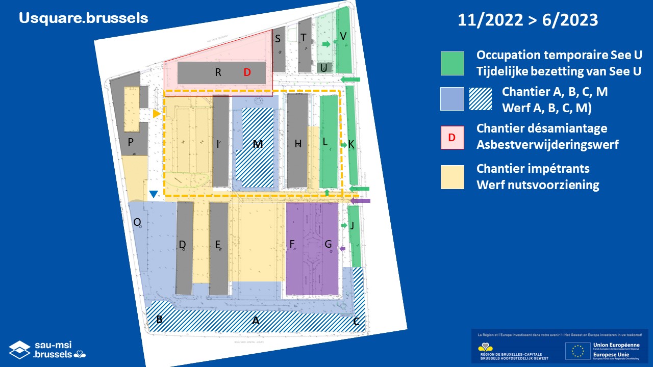 The SAU is the regional public body responsible for carrying out major urban development projects in Brussels. For Usquare.brussels, it is coordinating all conversion operations; it initiated and financed the temporary occupation programme See U; it is supporting the universities in the development of student accommodation; it is in charge of the energy networks; it is the project manager for the redevelopment of the public spaces; and it is responsible for the development of shared facilities, including the food court (Building M), and local shops.