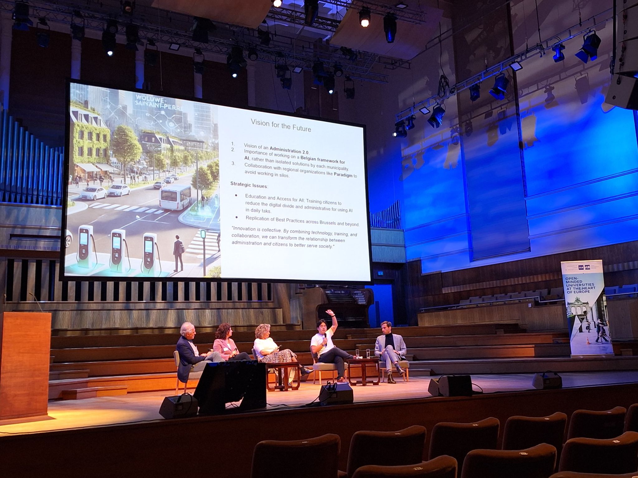 De dag startte met inspirerende openingswoorden van de rectoren van de Université Libre de Bruxelles (ULB) en de Vrije Universiteit Brussel (VUB). De openingstoespraak benadrukte de samenwerking tussen de twee Brusselse universiteiten en zette de toon zetten voor het thema van de conferentie: ‘AI, een Publiek Goed?’.