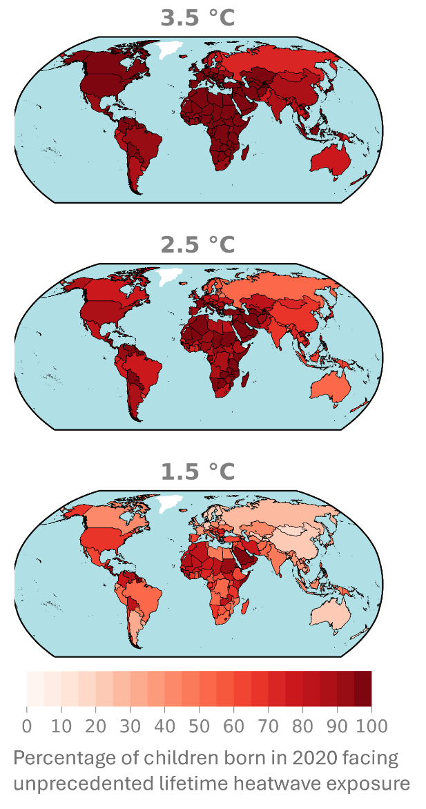 Under a 3.5 °C pathway, 1509 million children aged 5-18 in 2025 face unprecedented lifetime exposure to heatwaves.