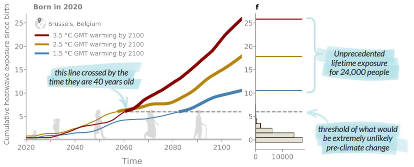 Research led by climate scientists from the Vrije Universiteit Brussel (VUB) reveals that millions of today’s young people will live through unprecedented lifetime exposure to heatwaves, crop failures, river floods, droughts, wildfires and tropical storms under current climate policies. If global temperatures rise by 3.5°C by 2100, 92% of children born in 2020 will experience unprecedented heatwave exposure over their lifetime, affecting 111 million children. Meeting the Paris Agreement's 1.5°C target could protect 49 million children from this risk. This is only for one birth year; when instead taking into account all children who are between 5 and 18 years old today, this adds up to 1.5 billion children affected under a 3.5°C scenario, and with 654 million children that can be protected by remaining under the 1.5°C threshold. The study also highlights that children with high socioeconomic vulnerability face an even greater likelihood of unprecedented exposure to climate extremes in their lifetime. Deep cuts in greenhouse gas emissions are urgently needed to safeguard the lives of children all around the world.
